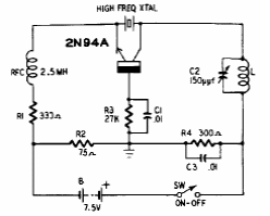 A frequência deste oscilador depende do cristal usado e tem limite dado pelo transistor. O circuito é dos anos 50 com um transistor de germânio da época indicado.