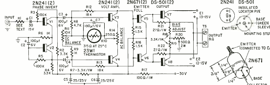 Este amplificador foi publicado na revista Radio Electronics de setembro de 1959. O circuito de 8 transistores não usa transformador de saída e é alimentado por tensão de 13 a 15 V.