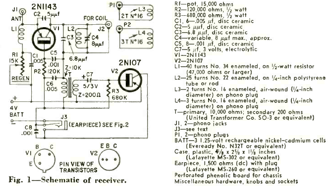 Este receptor de VHF de bolso foi encontrado na revista Radio Electronics de janeiro de 1961. Ele usa um transistor e sintoniza a faixa dos 11 metros, considerada VHF na época.