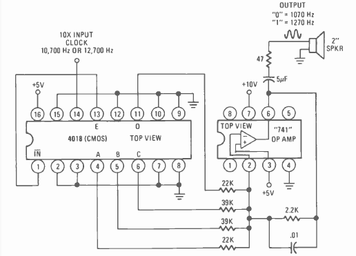 Este gerador CMOS com o 4018 foi encontrado na revista Radio Electronics de novembro de 1976. Ele usa um operacional 741 como amplificador de áudio.