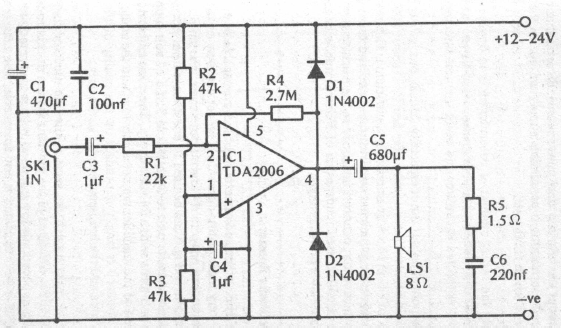 Encontramos este circuito para treino de guitarra numa documentação inglesa de 1989. Os componentes são da época e a fonte deve ter pelo menos 1 A.