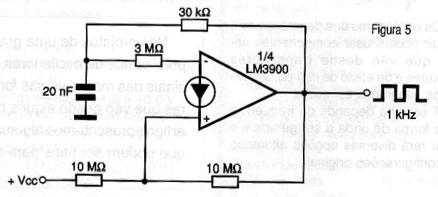 O circuito apresentado na figura 5 gera sinais retangulares com base em um amplificador operacional de transcondutância (Norton) do tipo LM3900, da National Semiconductor. Os valores dos componentes indicados para esta aplicação fazem-na gerar um sinal de 1 kHz, mas eles podem ser alterados desde que não seja ultrapassado o limite do amplificador operacional, que é de algumas centenas de quilohertz. O circuito deve ser alimentado com fonte simétrica de 6 a 12 V, e os demais amplificadores operacionais do LM3900, que é quádruplo, podem ser aproveitados para outra finalidade.