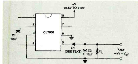 Este circuito de muito baixa corrente com o ICM7860 foi encontrado na revista Electronics Now de abril de 1995. A tensão de saída depende da tensão de entrada.
