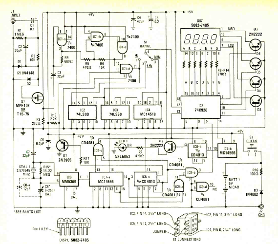 Este circuito é de uma Radio Electronics de março de 1978. O circuito de 4 dígitos usa um módulo da época e é alimentado por bateria. Os principais circuitos integrados são CMOS e TLL.