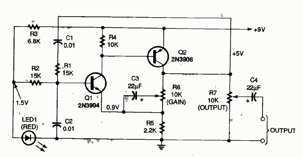 Este oscilador senoidal de baixa frequência foi encontrado na revista Electronics Now de dezembro de 1995. O circuito de dois transistores é uma ponte de Wien ou Viena operando em 1 kHz.