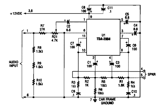 Este amplificador de áudio para o carro foi encontrado numa Popular Electronics Hobbyst Handbook dos anos 90. O circuito usa o TDA2004 para aumentar a saída de rádio de carro dos carros da época.