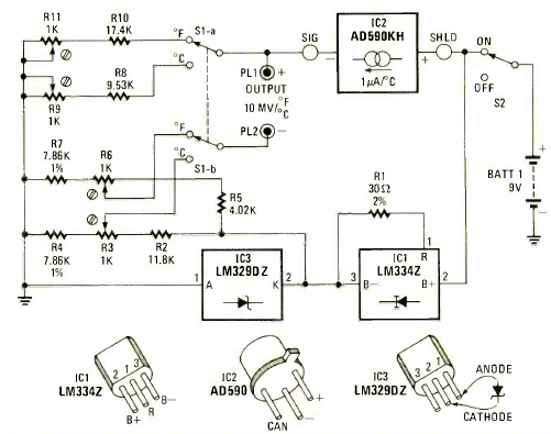 Este circuito foi encontrado na revista Radio Electronics de julho de 1978. O circuito usa o voltímetro digita comum como indicador. Os sensores são circuitos integrados da época.