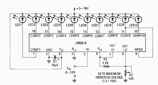 O circuito mostrado com o LM3914 foi encontrado na revista Radio Electronics de março de 1992. O circuito tem um ajuste pra o fundo de escala.