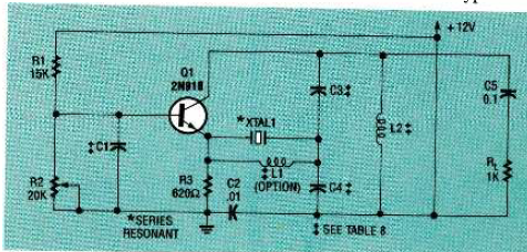 Este circuito foi descrito num artigo da revista Radio Electronics de fevereiro de 1993. A frequência depende do cristal e L1 é opcional.