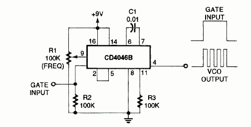 Encontramos este circuito que faz uso da porta OR interna do 4046 numa revista Electronics Now de agosto de 1997. A faixa de frequências depende de C1.