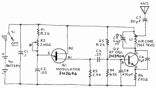 Este circuito pode enviar sinais tanto na faixa de VHF como FMN com um alcance de algumas dezenas de metros. O circuito é de uma Radio Electronics de dezembro de 1980. Para a faixa de FM a bobina tem 4 + 4 espiras de fio 26 ou 28 com 0,5 cm de diâmetro sem núcleo.