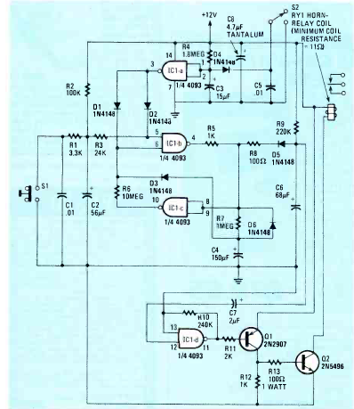 Este circuito foi sugerido pela revista Radio Electronics de setembro de 1983 na seção de novas ideias. Os componentes são comuns e os transistores admitem equivalentes.