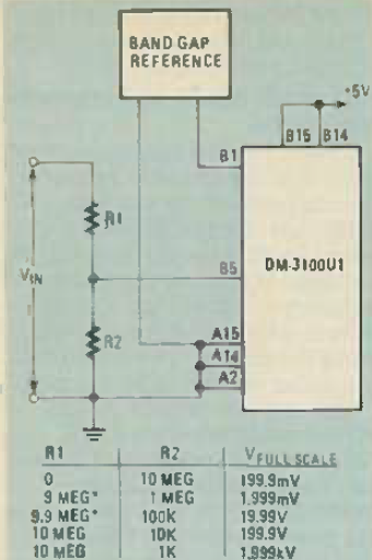 Este é um circuito de utilização do módulo digital DM31O0UI. Encontramos num artigo da revista Radio Electronics de fevereiro de 1984. A referência de tensão pode ser feita com rede de resistores.