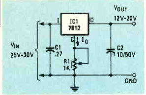 Na figura temos o modo de se variar a tensão de saída de um regulador 7812 entre 12 V e 2V a menos que a tensão de entrada. O circuito é de uma Radio Electronics de julho de 1984 podendo ser aplicado a reguladores da série com outras tensões.