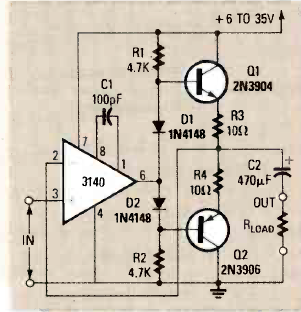 Este circuito complementar aumenta a potência de saída de um amplificador operacional. Podem ser obtidas saídas com correntes até 50 mA.