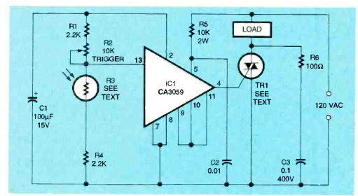 Usando um CA3059 este circuito foi encontrado na revista Electronics Now de julho de 1995. O triac deve ser dotado de dissipador de calor.