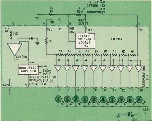 Este circuito básico que mostra o LM3914 “por dentro” saiu na revista Radio Electronics de outubro de 1980. Observe que R1 determina o brilho e que a alimentação é feita com 9 V.
