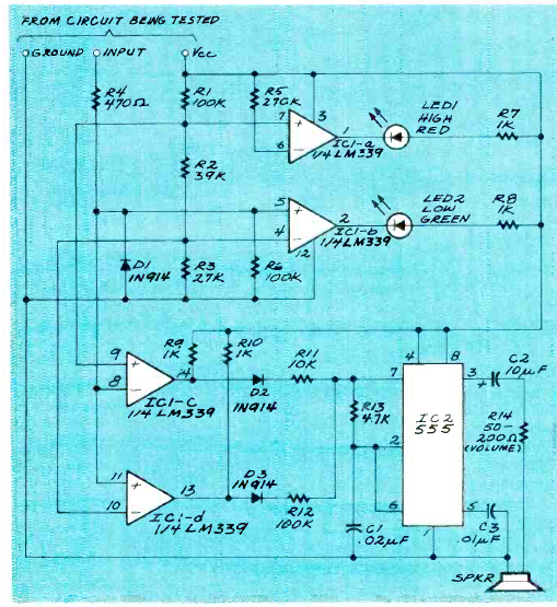 Este circuito tem a indicação de estado visual e audível utilizando um oscilador. O circuito é de uma revista Radio Electronics de junho de 1991.