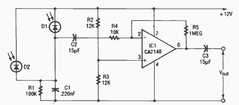 Este circuito para sensores de luz IR foi encontrado na revista Radio Electronics de julho de 1992. Ele está sintonizado para luz modulada de 20 kHz.