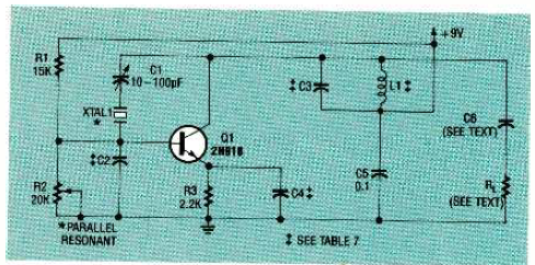 Este circuito usa um cristal ressonante em paralela para controlar a frequência. O circuito é de uma revista Radio Electronics de fevereiro de 1993. Transistores equivalentes podem ser empregados.