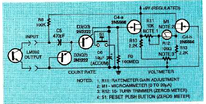 Este circuito faz parte deum artigo publicado na revista Electronics Now de fevereiro de 1994. O circuito usa um instrumento analógico para contar pulsos que são integrados.