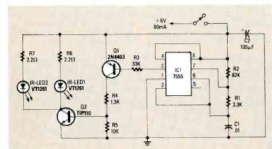 Encontramos este circuito na revista Radio Electronics de maio de 1989. O circuito usa LEDs infravermelhos num link de alta frequência com o 555.