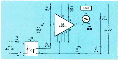 Este circuito usa um acoplador óptico para comutar uma carga na rede de energia. O circuito é da revista Electronics Now de julho de 1995. O CA3059 não é comum atualmente.