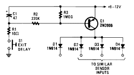 Este circuito proporciona um retardo para a ativação de um alarme dando tempo para que o proprietário deixe o local. O circuito é de uma Enciclopédia de Circuitos Eletrônicos Volume 5 de 1995.
