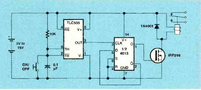 Este circuito biestável que aciona um relé com um pulsador foi encontrado na revista Electronics Now de março de 1pp6. Pode ser usado um bipolar comum com um resistor de 1k na base em lugar do FET.