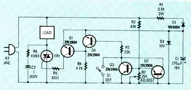 Neste circuito o triac conduz quando a chave S1 é aberta. Encontramos na revista Radio Electronics de outubro de 1987. O triac é de acordo com a carga controlada.