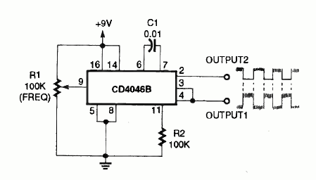Este circuito foi encontrado na revista Electronics Now de agosto de 1994. O 4046 é pouco comum em nossos dias e a faixa de frequências é dada por C1.