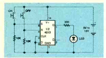 Este circuito serve para uma demonstração didática do funcionamento de um biestável ou flip-flop. O circuito é da revista Electronics Now de março de 1996. Pode ser usado um relé em lugar do LED.