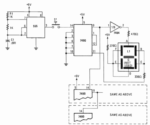 Este circuito digital foi encontrado na revista Radio Electronics de setembro de 1980. O circuito usa lógica TTL devendo ser alimentado com5 V. O efeito de corrimento dos segmentos pode ser alterado com a troca de C1.