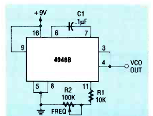 Usando o PLL 4046 encontramos este circuito na Radio Electronics de dezembro de 1989. O circuito gera sinais na faixa determinada pelo capacitor C1.