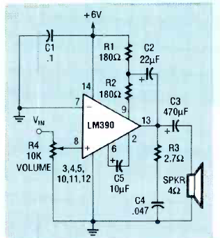 Este pequeno amplificador de áudio se baseia no LM390 com um mínimo de componentes externos. Encontramos na revista Radio Electronics de abril de 1990.