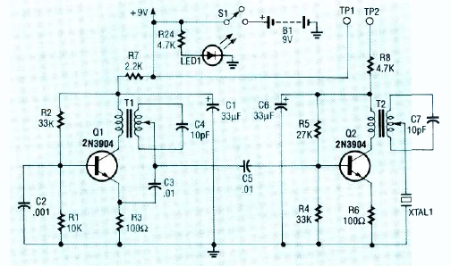 Este circuito foi encontrado numa revista Radio Electronics de novembro de 1991. O circuito opera em 2,2 MHz e tem uma saída de baixa impedância.