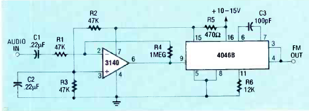 Usando um PLL 4046 encontramos este circuito na revista Radio Electronics de dezembro de 1989. O circuito opera em 220 kHz mas esta frequência pode ser alterada pela troca de C3.