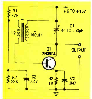 Este circuito foi encontrado na revista Electronics Now de dezembro de 1993. Com os componentes indicados a frequência está em torno de 1 MHz. O sentido dos enrolamentos de T1 é importante.