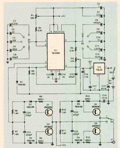 Usando um duplo 555 CMOS este circuito de grande utilidade na bancada foi encontrado na revista Electronics Now de julho de 1998. O circuito é alimentado por bateria.