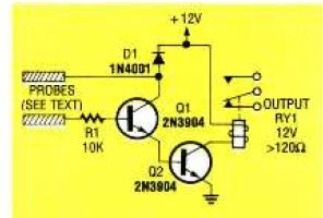 Este circuito aciona um relé quando as barras condutoras (probes) são seguras por uma pessoa. O circuito é de uma Electronics Now e a tensão de alimentação depende do relé.