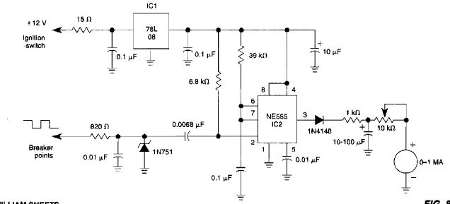 Este circuito com instrumento analógico foi encontrado num Wlilliam Sheets dos anos 90. Os componentes são comuns, servindo apenas para carros com comutação mecânica (platinado).