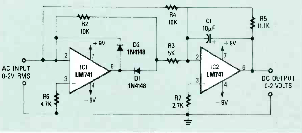 Este circuito com dois operacionais foi encontrado na revista Radio Electronics de setembro de 1989. Outros operacionais podem ser utilizados. A fonte deve ser simétrica.