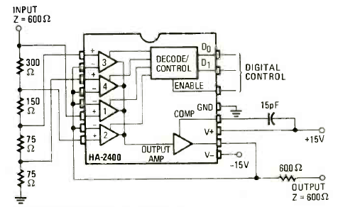 Este circuito usa um HA2400 que consiste em 4 amplificadores operacionais controlados digitalmente. O circuito é de uma revista Radio Electronics de março de 1980. A fonte deve ser simétrica.