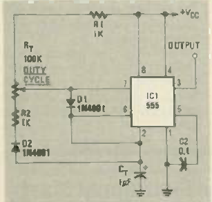 Este circuito permite variar o ciclo ativo sem mudar a frequência. Uma aplicação interessante para controles PWM. O circuito é de uma revista Radio Electronics de julho de 1985.