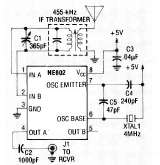 Este circuito converte sinais da faixa de ondas longas de 350 kHz a 500 kHz para 4,35 a 5 MHz. O circuito é de uma Radio Electronics de abril de 1990.