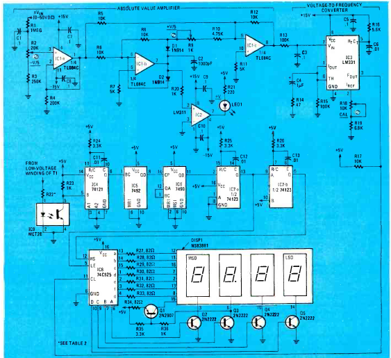 Este circuito foi encontrado na revista Radio Electronics de fevereiro de 1983. Trata-se de um circuito de 4 dígitos com circuitos integrados dedicados, não sendo indicada a fonte de alimentação.