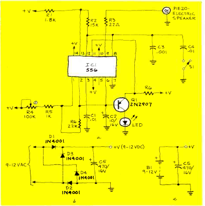 Este circuito foi publicado na seção de ideias da revista Radio Electronics de agosto de 1983. O circuito se baseia no conhecido 555 e é alimentado por uma tensão de 9 V. Duas opções de fontes são dadas.
