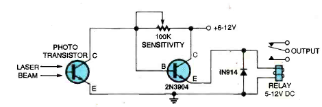 Este circuito dispara um relé quando um feixe de luz que incide no fototransistor é cortado. O circuito é de uma Electronics Now e a tensão de alimentação depende da tensão do relé.