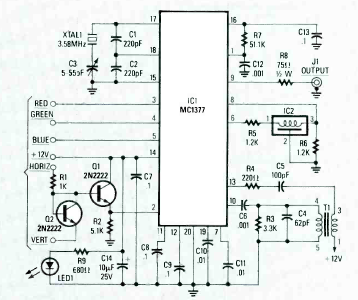 Este circuito goi encontrado na revista Electronics Experimenters handbook de 1991. Ele pode ser usado para visualizar sinais RGB em televisores NTSC antigos.