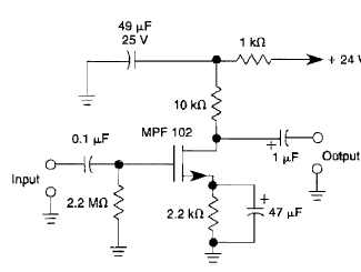 Esta etapa amplificadora de uso geral foi encontrada na Enciclopédia de Circuitos Electronics Volume 5 de 1995. Qualquer JFET pode ser usado e a faixa passante é de 100 kHz com 20 dB de ganho.